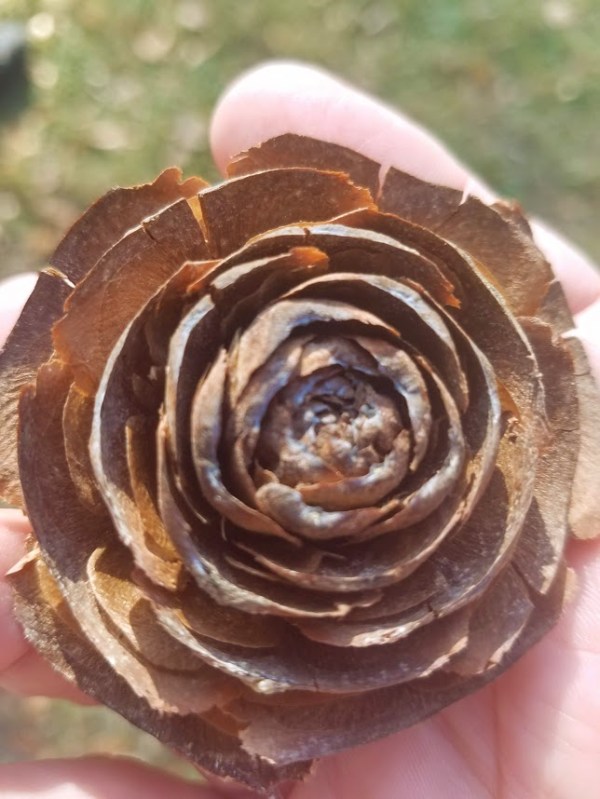 We always discover something interesting when we walk around the neighborhood. I picked one of these up a few days ago. I’m not very knowledgable about naming plants–certainly I don’t know what tyoe of tree this is from. But what I liked most is that this looks like a rose that will never wilt. And it made me smile.